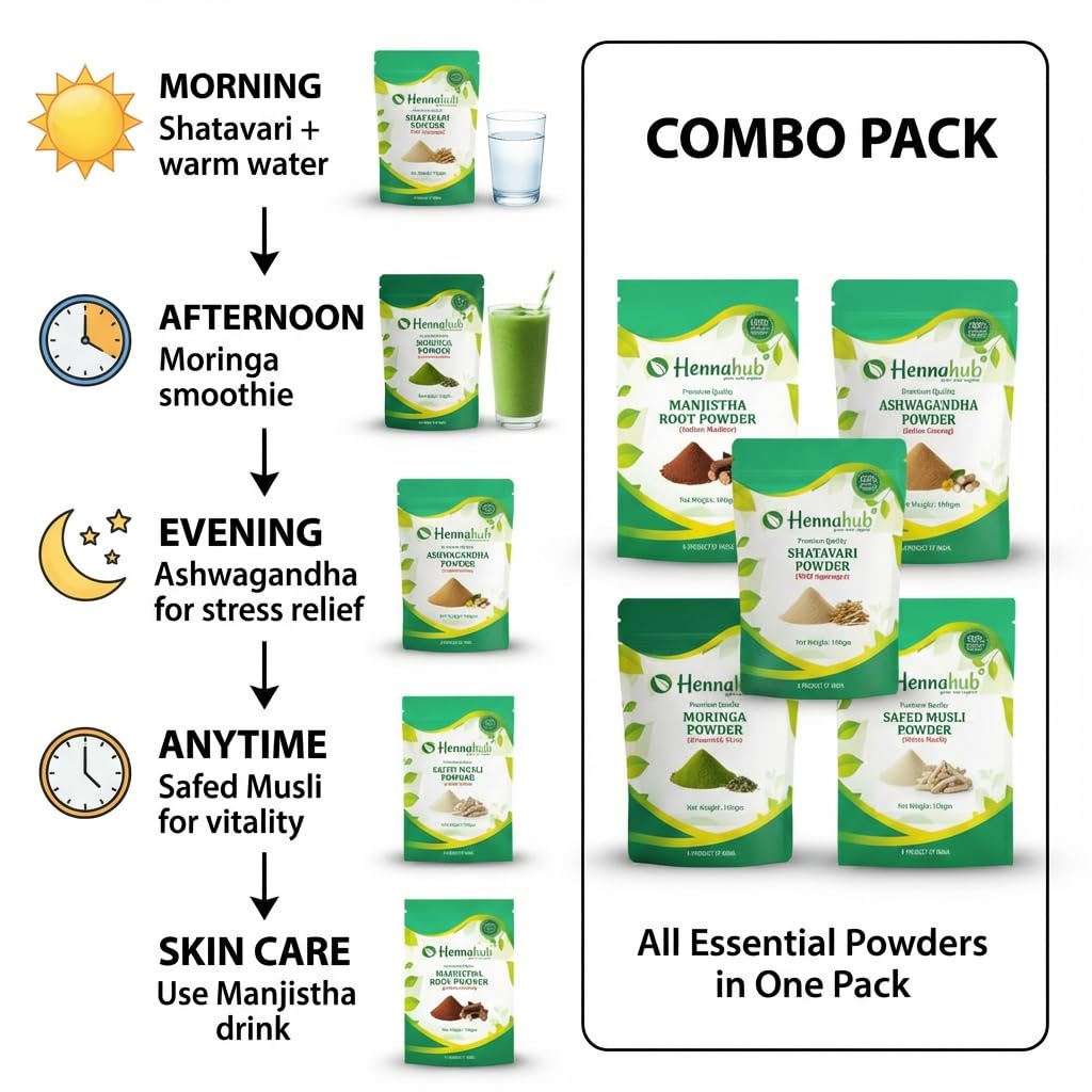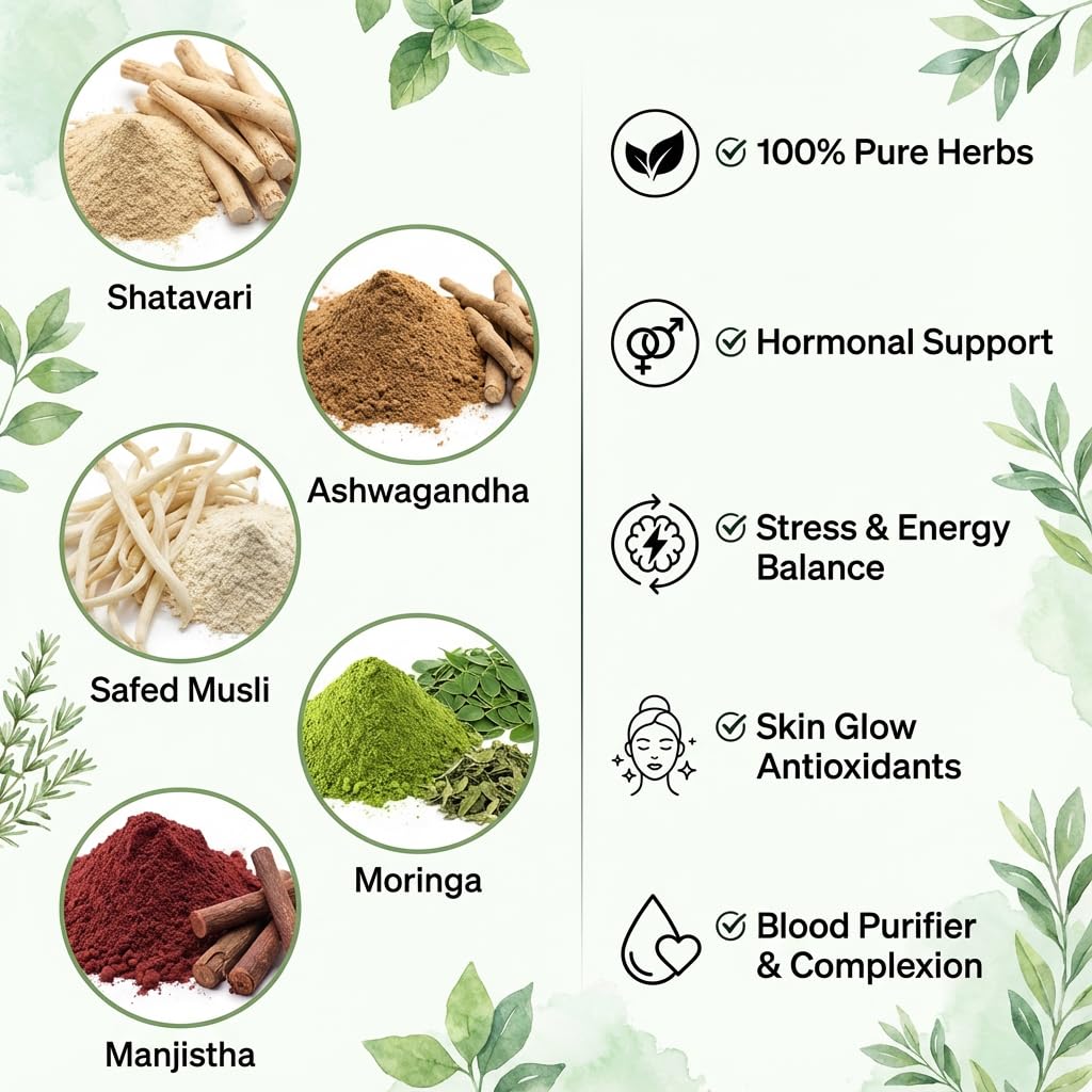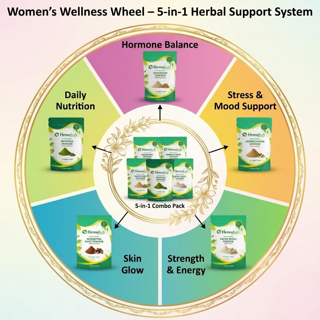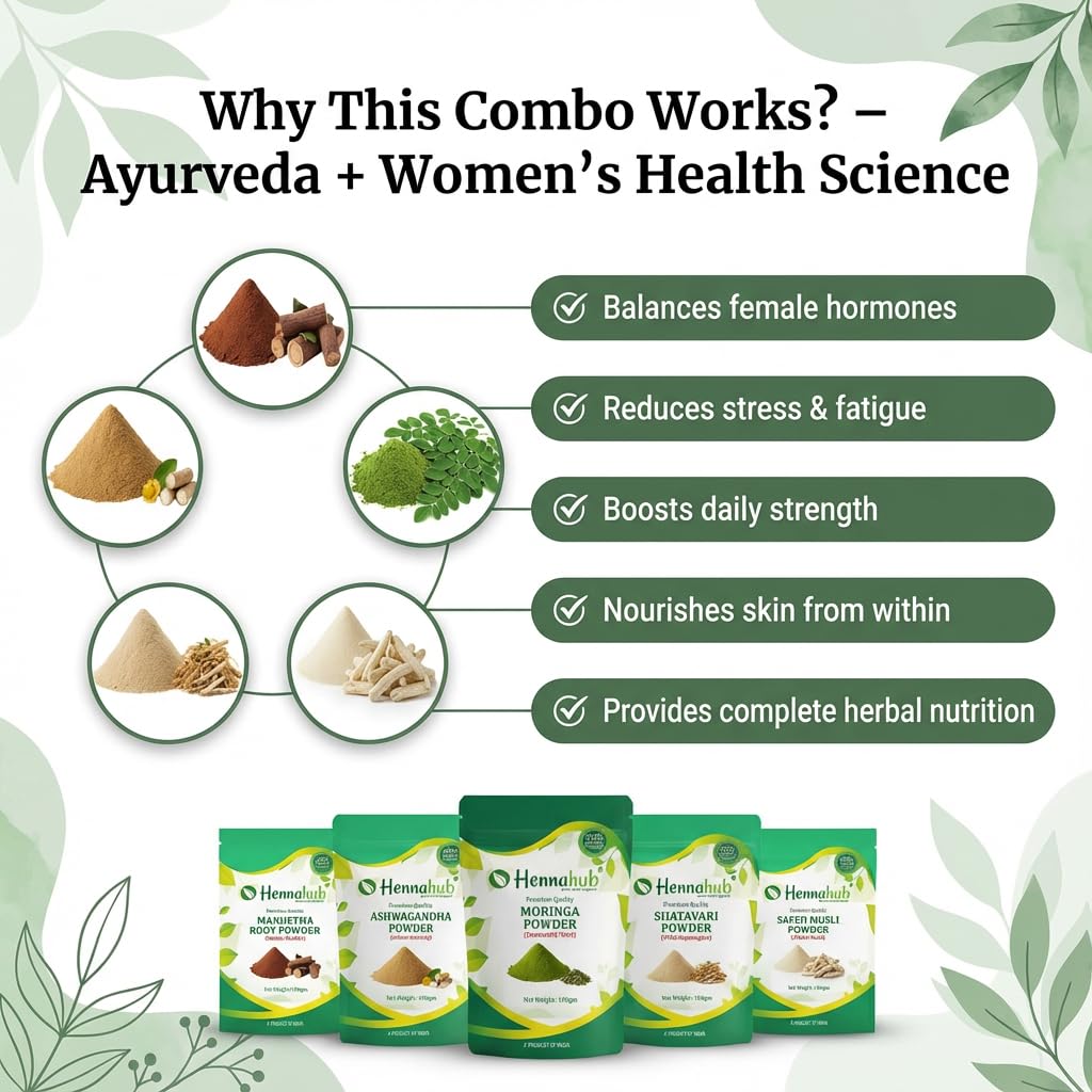 Hennahub Women’s Complete Wellness Combo | Shatavari, Ashwagandha, Safed Musli, Moringa & Manjistha Powder | Pack of 5 x 100g | Hormonal Balance, Energy, Skin Glow & Daily Nutrition | Ayurvedic Women Care